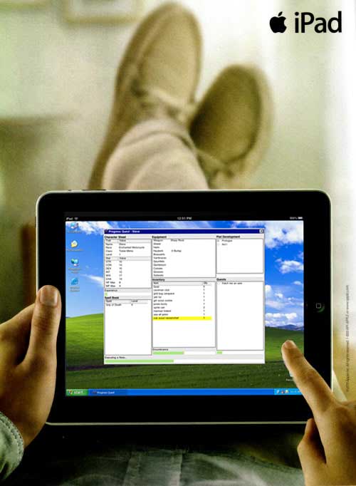 | PQ on your iPad You can already play the online version of Progress Quest on your iPad; while the game is running, touch the '+' button and select 'Add to Home Screen' for the optimal gameplay experience. It's just like having a native PQ app on your iPad! Look how much fun this guy in the Wallabies is having! ![]() [July 21, 2010] |