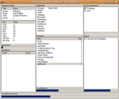 Progress Quest is a "fire and forget" computer role-playing game, where you create a fantasy character and watch it advance. You may play alone or contact an online realm for a shared gaming experience. Progress Quest is available to anyone free of charge under a very permissive license. Source code for the game, however, is not publicly available.